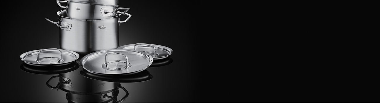 Pot lids prevent steam from escaping the pot during cooking. By keeping the heat in the pot, food cooks faster. This saves time and energy. Fissler cookware lids made of high-quality 18/10 stainless steel or quality glass are available in various sizes and are suitable for corresponding Fissler pans, cookware, and pressure cookers.